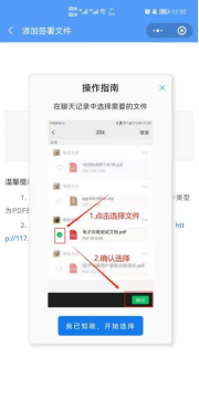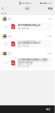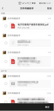4)点击“点击添加文件,开始签章”,打开微信聊天记录页面,在聊天记录中点击左侧圆圈选中需要的文件, 点击下方“确定”按钮确认选择该文件。手机端签署目前仅支持选择190MB以下、文件类型为PDF的文件。