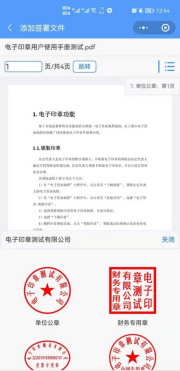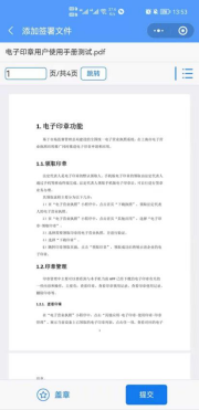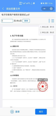 目前一次仅支持盖一种印章类型,同一种印章类型一次可盖多处。再次点击下方“盖章”按钮,选择电子印章,在文档中选择新的盖章位置。右上角展示当前文档已选电子印章和盖章位置,点击可跳转至当前的盖章位置。