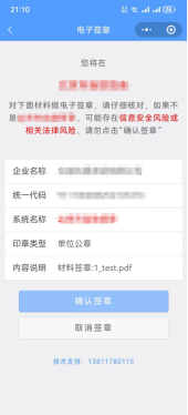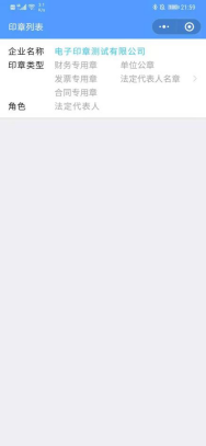 5)展示已选择的待签署文件,点击下方“盖章”按钮,查询出当前执照已领取的电子印章。