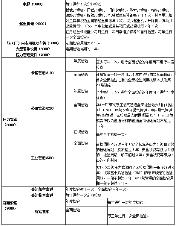 ▲承压类设备3种,即锅炉、压力容器(含气瓶)、压力管道;▲机电类的5种,即电梯、起重机械、客运索道、游乐设施、场(厂)内机动车辆。其中,电梯,是指动力驱动,利用沿刚性导轨运行的箱体或者沿固定线路运行的梯级(踏步),进行升降或者平行运送人、货物的机电设备,包括载人(货)电梯、自动扶梯、自动人行道等。客运索道,是指动力驱动,利用柔性绳索牵引箱体等运载工具运送人员的机电设备,包括客运架空索道、客运缆车、客运拖牵索道等。大型游乐设施,是指用于经营目的,承载乘客游乐的设施,其范围规定为设计最大运行线速度大于或者等于2m/s,或者运行高度距地面高于或者等于2m的载人大型游乐设施。特种设备包括其附属的安全附件、安全保护装置和与安全保护装置相关的设施。