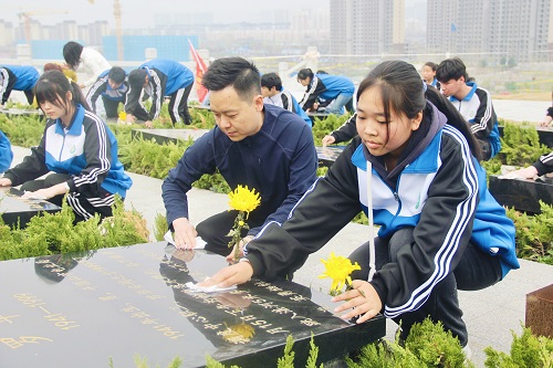 3月26日上午,在市烈士陵园,平顶山市特殊教育学校60多名学生和老师一起献花扫墓,缅怀英烈。