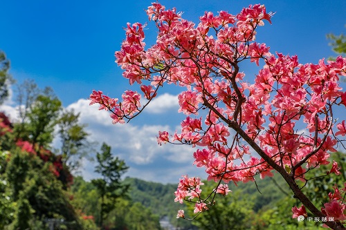 四月的伏牛山腹地,鲁山县四棵树乡平沟村的杜鹃岭正上演着最热烈的春之盛宴。4月25日,500余亩(1亩≈666.67平方米)山岭被20余万株野生杜鹃铺染成绚烂花海,花冠漏斗状的花朵次第舒展,猩红如燃、淡粉似霞、杏黄若金,间杂着清雅的白与沉静的紫,从岭脊绵延至沟底,密密匝匝织就无边无际的锦绣画卷。山风拂过,花枝轻摇,暗香浮动,连空气都染上了甜润的芬芳,为春日的山野注入了蓬勃的生命力。