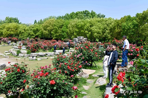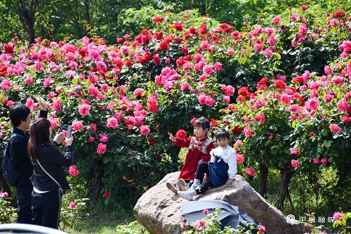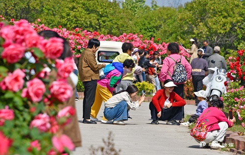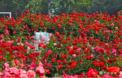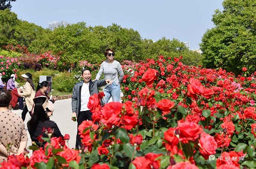 市民在月季山花丛中留影