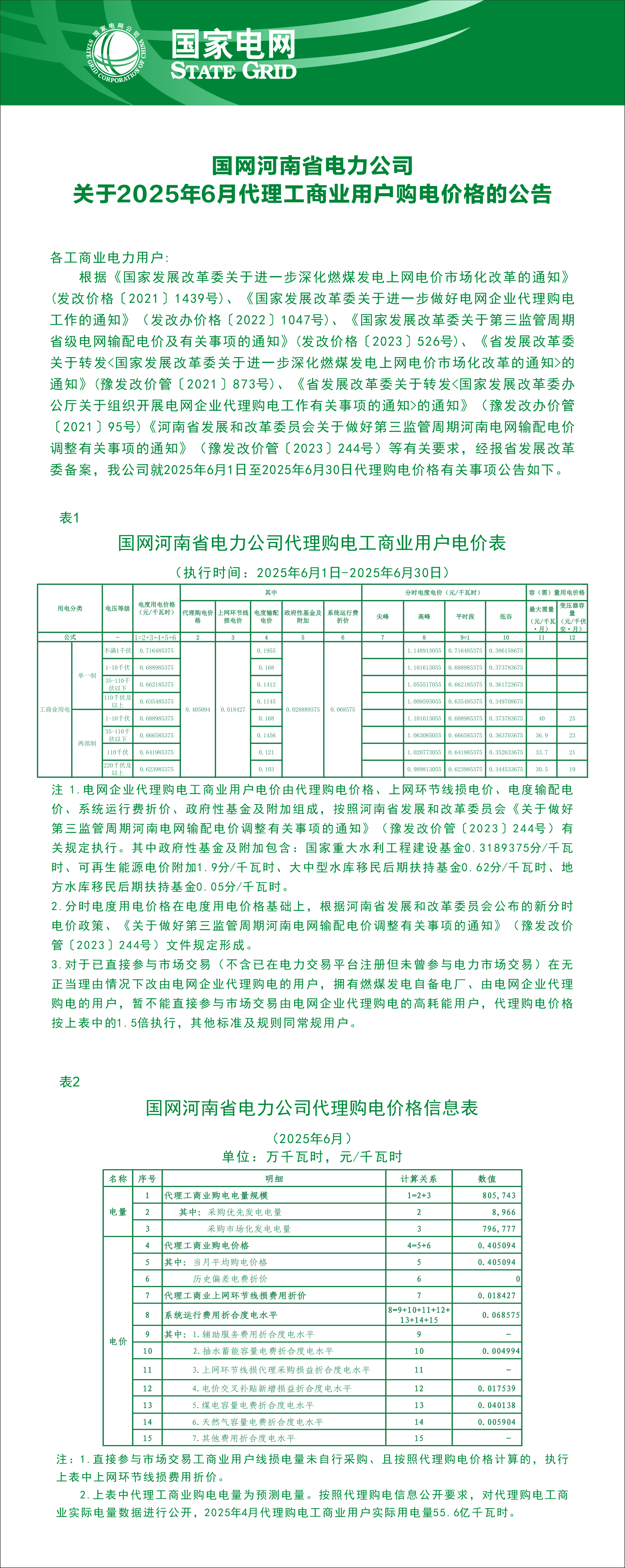 国网河南省电力公司关于2025年6月代理工商业用户购电价格的公告
