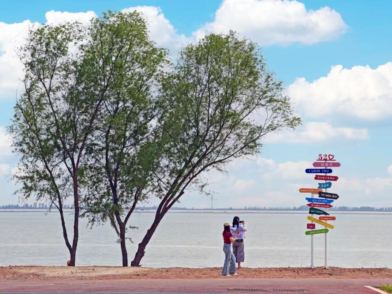 市民在白龟湖畔散步
