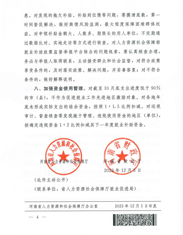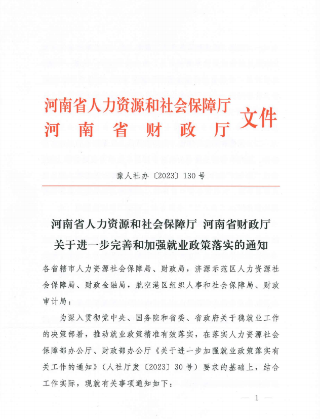 河南省人力资源和社会保障厅 河南省财政厅 关于进一步完善和加强就业政策落实的通知 豫人社办〔2023〕130号