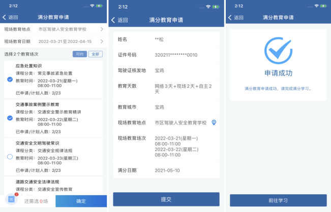 根据上一步选择的现场教育天数,选择相应天数的现场教育场次,完成学习场次确认后,进入信息确认页面,确认无误后提交满分申请;