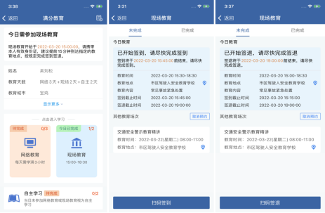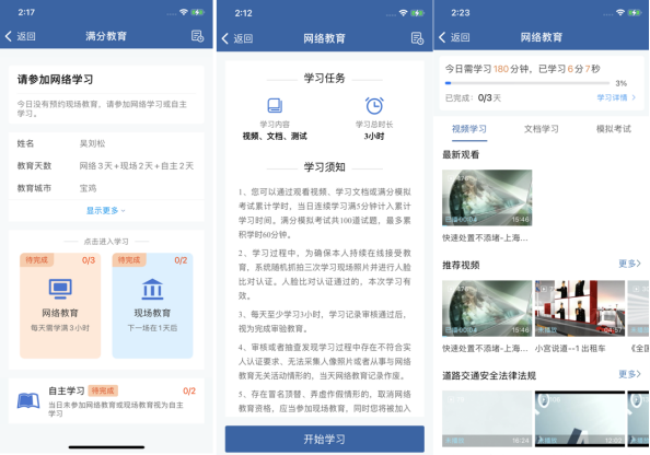 当天没有预约现场教育的,可以参加满分教育网络学习。满分网络学习形式包括课件学习和模拟考试,课件学习包括视频课件和文档课件,其中模拟考试每天学时最多计入60分钟。学习过程中系统不定时抓拍学习照片进行认证,认证通过的学时有效。当天累计学满3小时,由管理员审核通过后,视为当天教育完成。