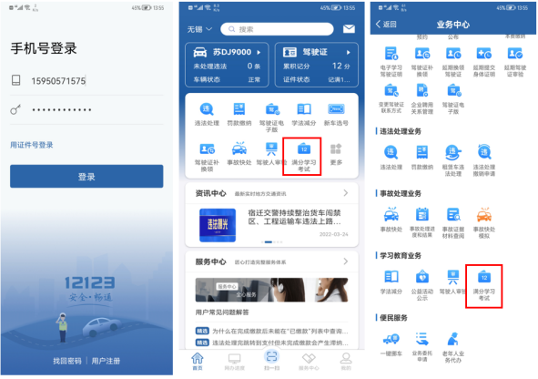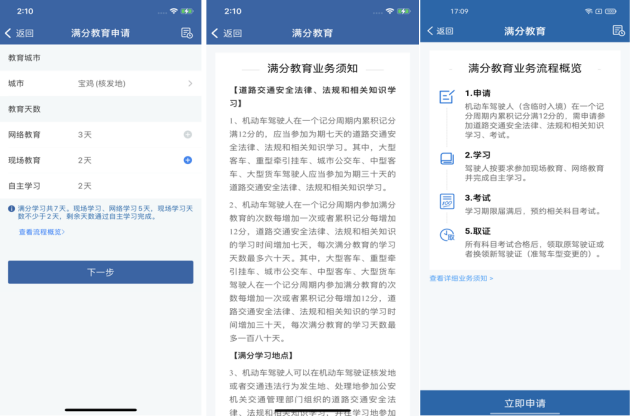 登录“交管12123”APP后,点击【满分学习考试】,符合条件的,进入满分教育申请流程。驾驶人用户可以选择驾驶证核发地或者违交通违法行为发生地、处理地参加满分教育。