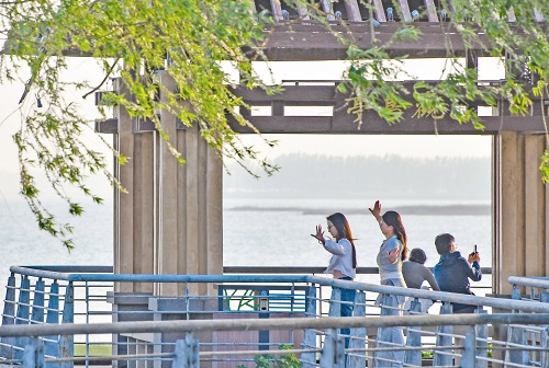 4月22日傍晚,白龟湖畔观景亭周边景色醉人,年轻女孩驻足拍照打卡,定格落日美景。