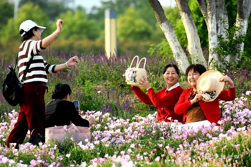 当天天气晴好。记者下午三四点赶到时,午后气温偏高,但已有不少市民前来赏花打卡。远远望去,大片粉色花朵铺展至远方,三五成群的游客漫步花海之间,有的驻足观赏盛放的花朵,沉浸式感受自然之美;有的拿出手机拍照;不少家长带着孩子亲近草木,自然嬉戏,尽享休闲惬意的亲子时光,处处是温馨和谐的春日图景。