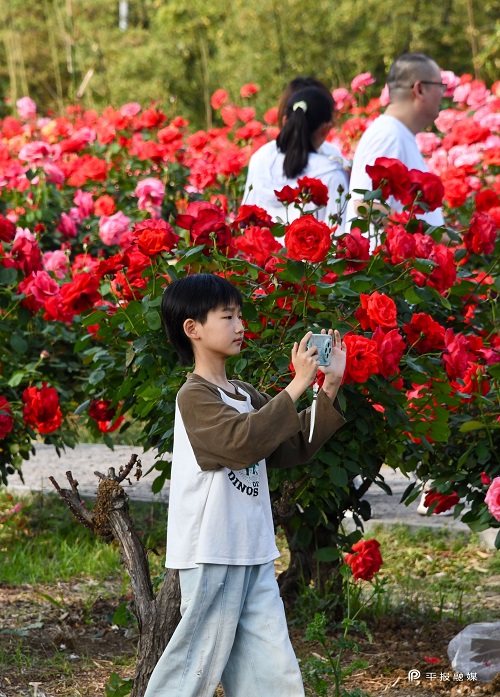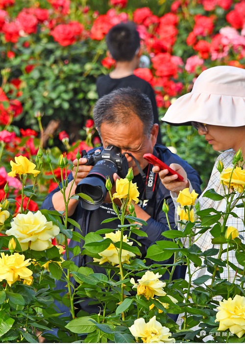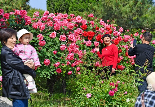 市民在月季山花丛中留影