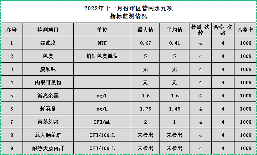 平顶山市自来水有限公司2022年11月份市区管网水质信息