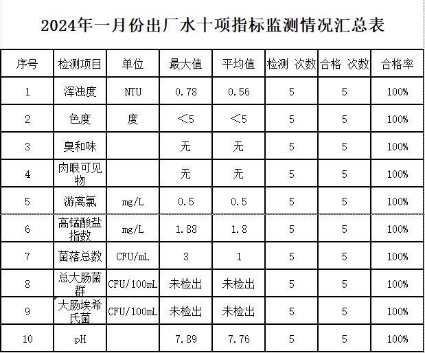 平顶山市自来水有限公司2024年1月份市区管网水质信息