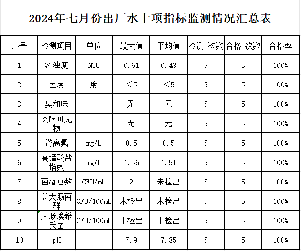 平顶山市自来水有限公司2024年7月份市区管网水质信息