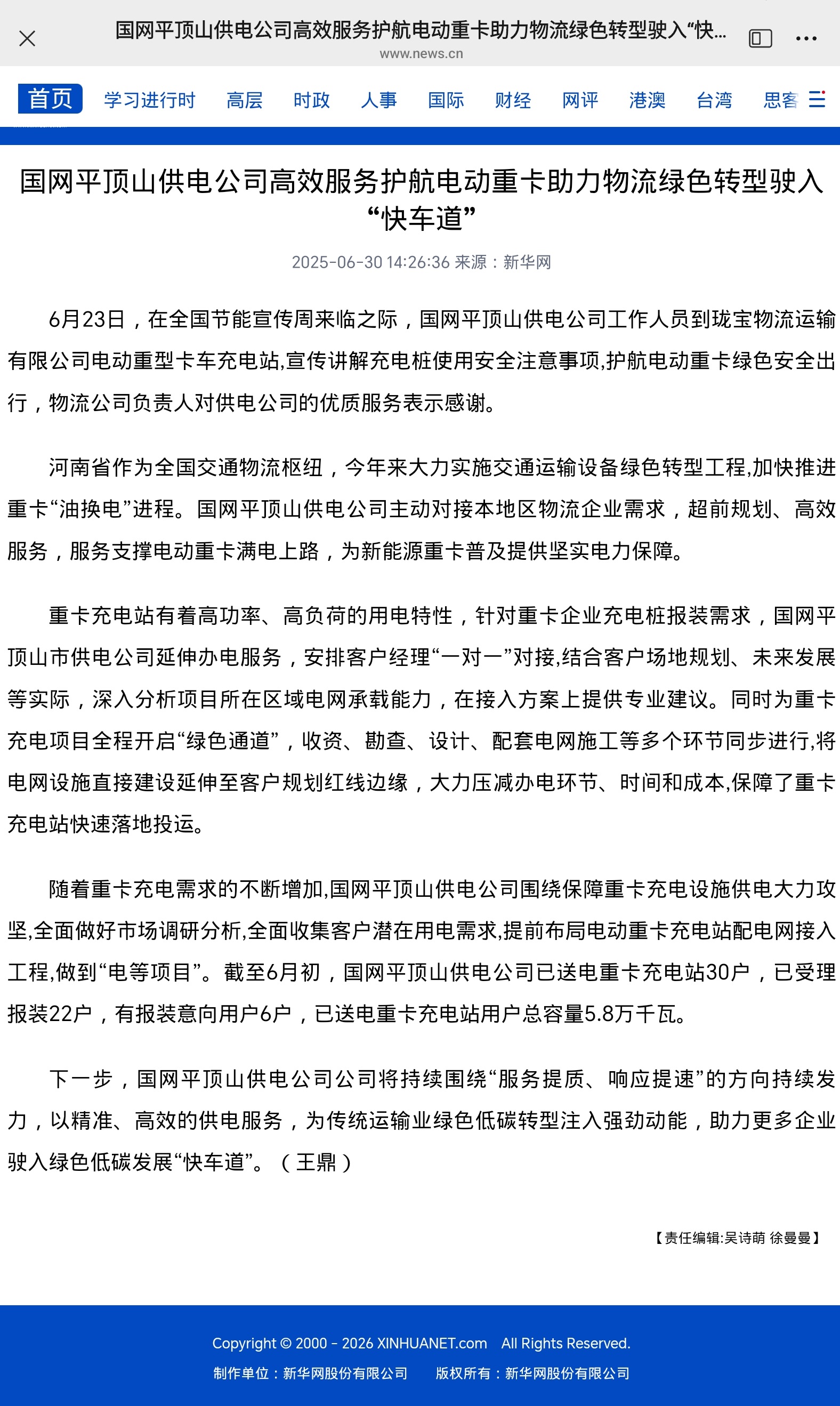 【新华网】国网平顶山供电公司高效服务护航电动重卡 助力物流绿色转型驶入“快车道”
