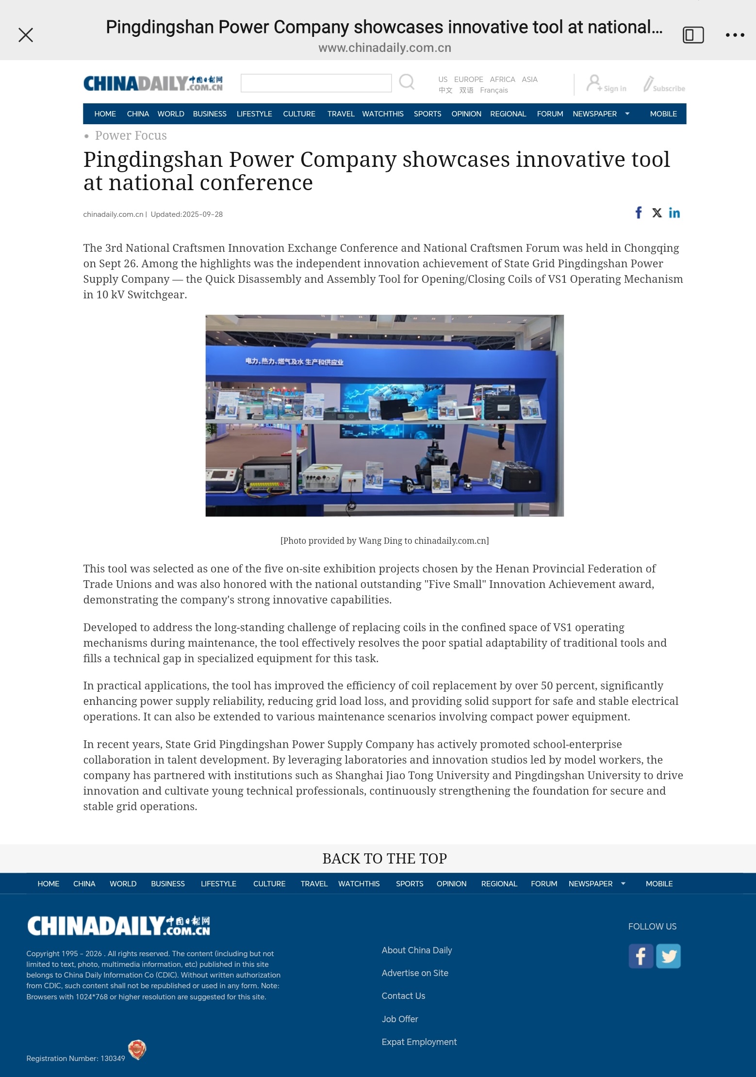 【中国日报英文网站】国网平顶山供电公司创新成果亮相第三届大国工匠创新交流大会
