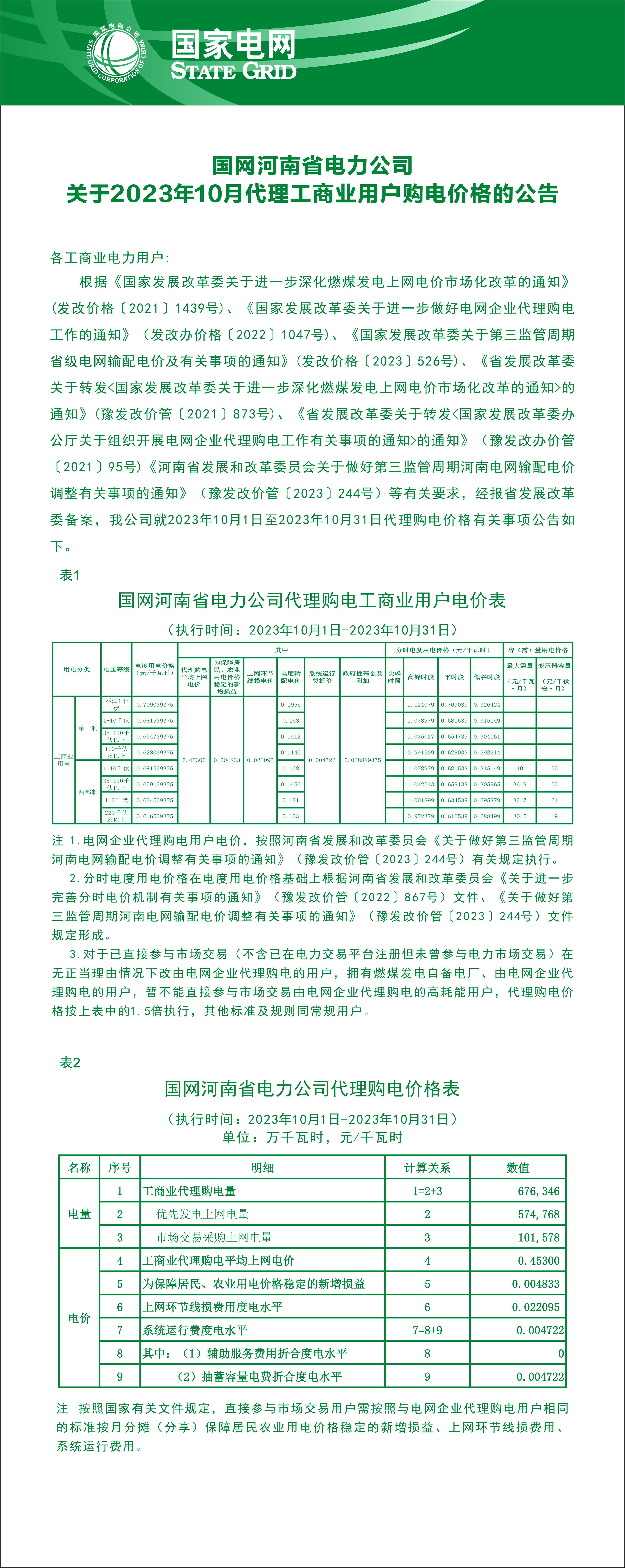 国网河南省电力公司关于2023年10月代理工商业用户购电价格的公告