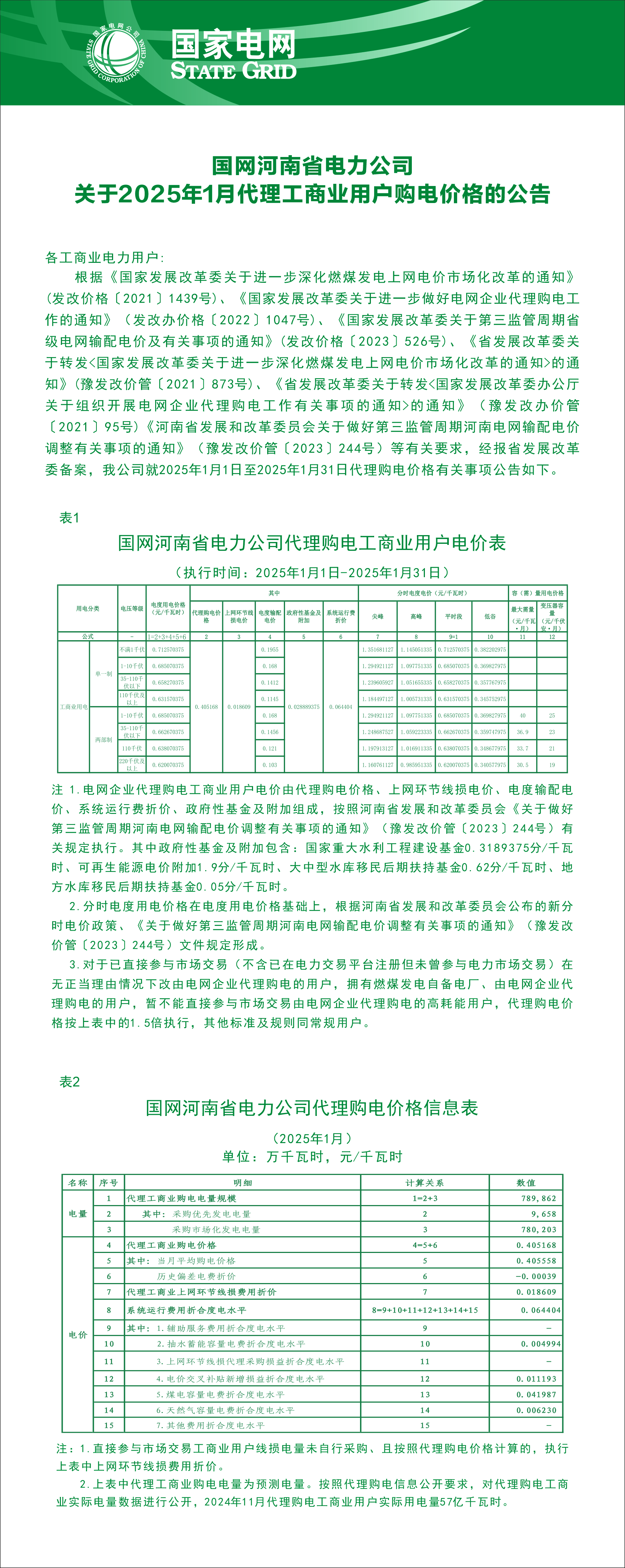 国网河南省电力公司关于2025年1月代理工商业用户购电价格的公告